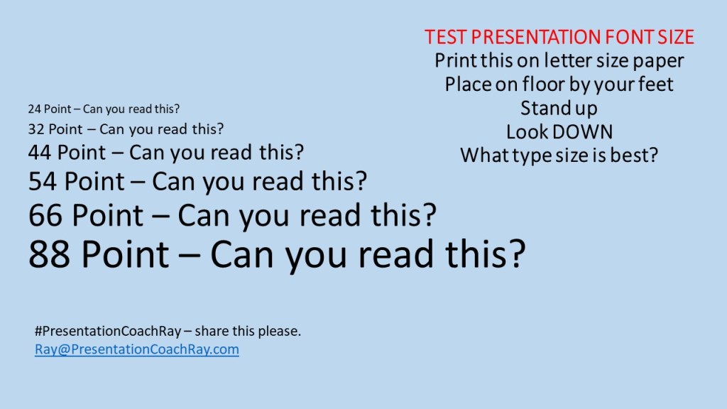 Printing your slide/graphic on letter-size paper, and placing it at your feet as you stand up, represented the proper font size.